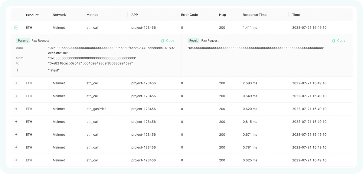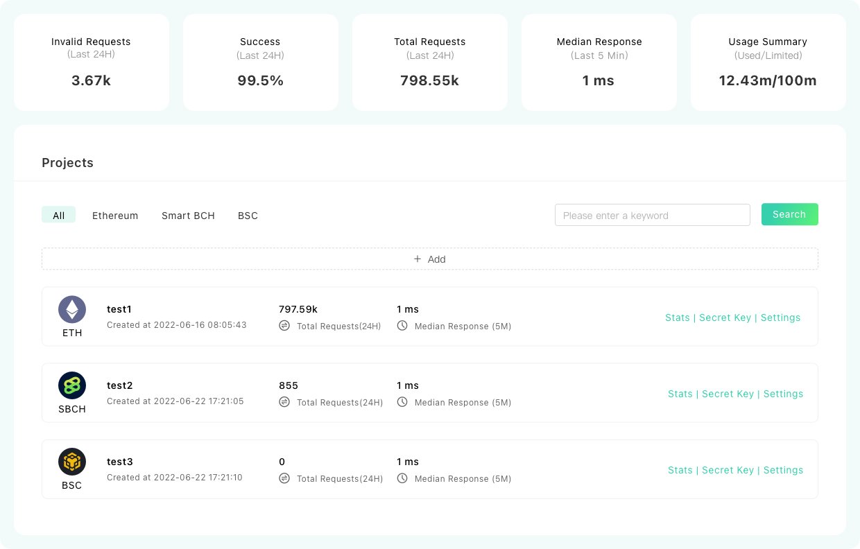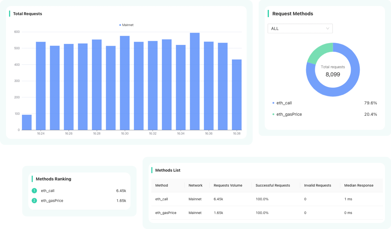 Provides a summary of API usage, automatically generate statistics by time, network and method.